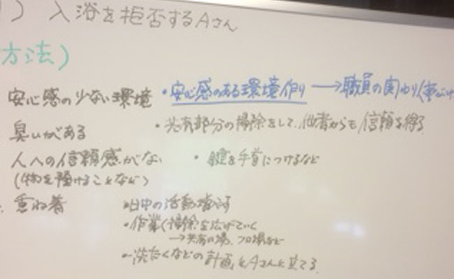 事例は「重度の認知症の方の環境を変えない暮らしの継続」と「入浴を拒否してしまう方」への対応の難しさについて検討を行いました。